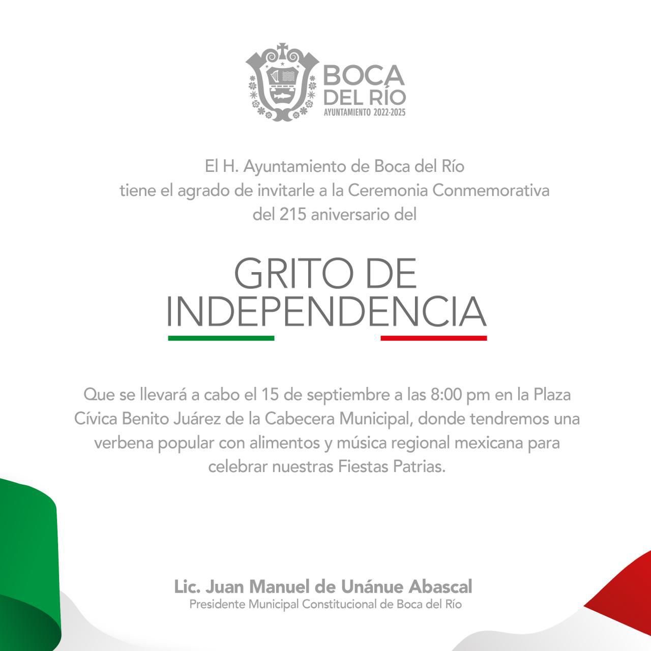 El alcalde de Boca del Río, Juan Manuel Unánue Abascal, encabezará la Ceremonia Conmemorativa del 215 Aniversario del Grito de Independencia de México la noche de este lunes 15 de septiembre.