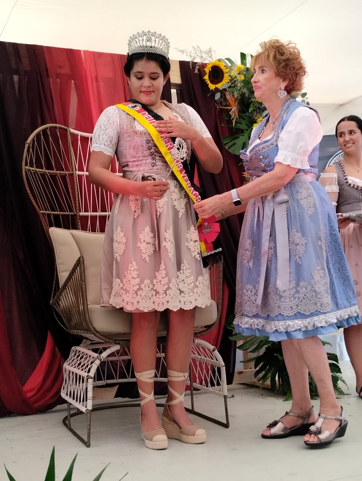Oded Rullan Seemann, José Antonio Marquinez, y Erika Rempening colocaron la corona, el centro y la banda a la nueva soberana del Oktoberfest 2025, Ana Victoria Lule Rangel, despidiendo a la reina 2024 Fátima Ahumada Vazquez.