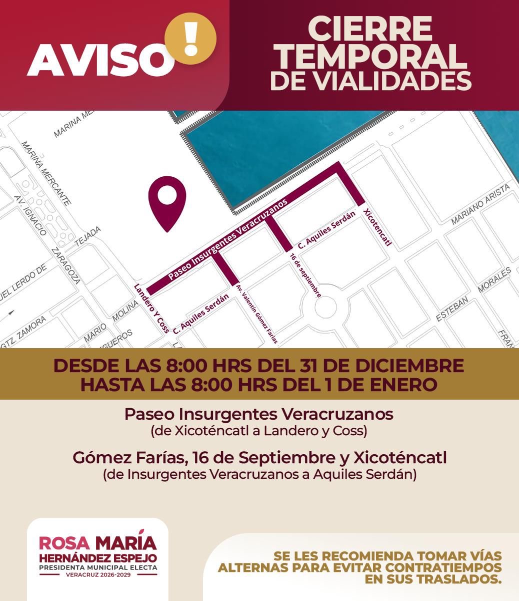 Les informamos que, con motivo de las actividades de fin de año, se realizará el cierre temporal de vialidades en la Zona Centro de Veracruz, a partir de las 8:00 a.m. del miércoles 31 de diciembre de 2025 y hasta las 8:00 a.m. del jueves 1 de enero de 2026.