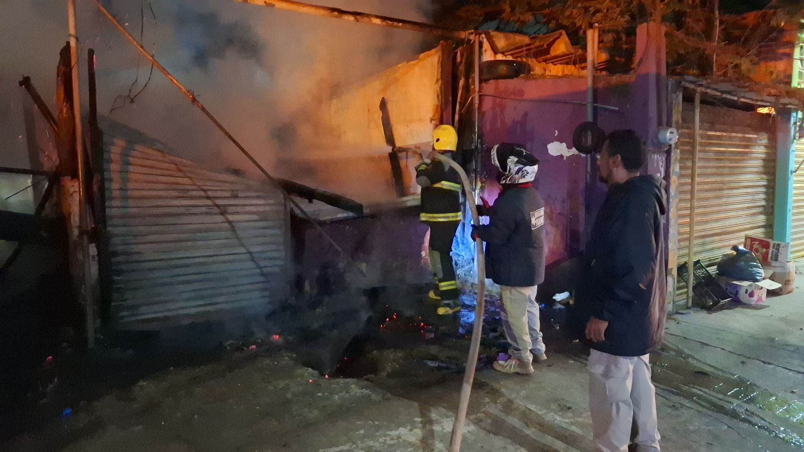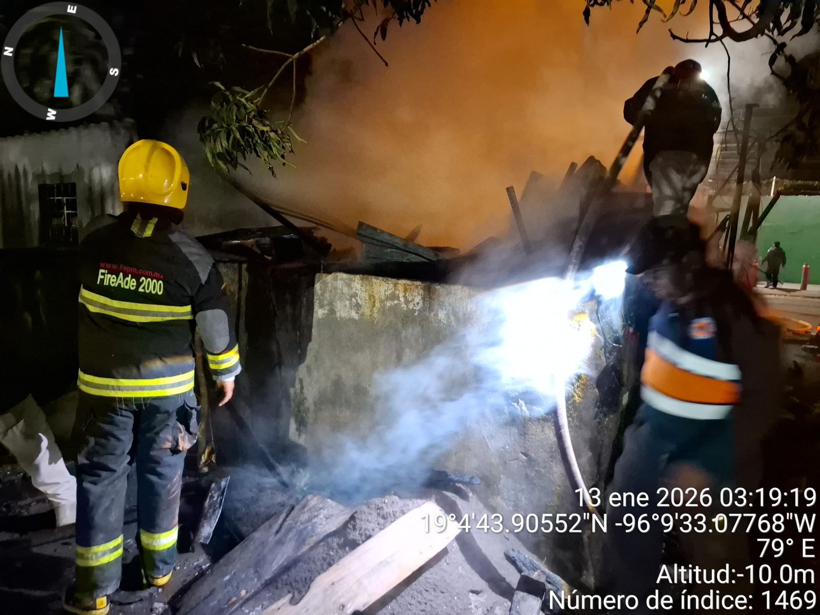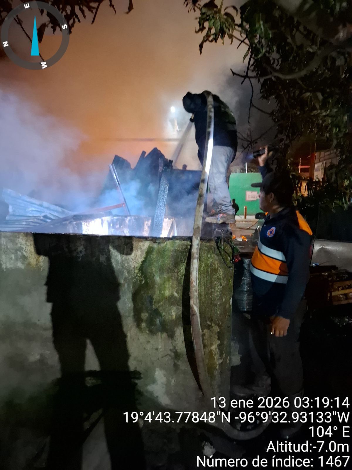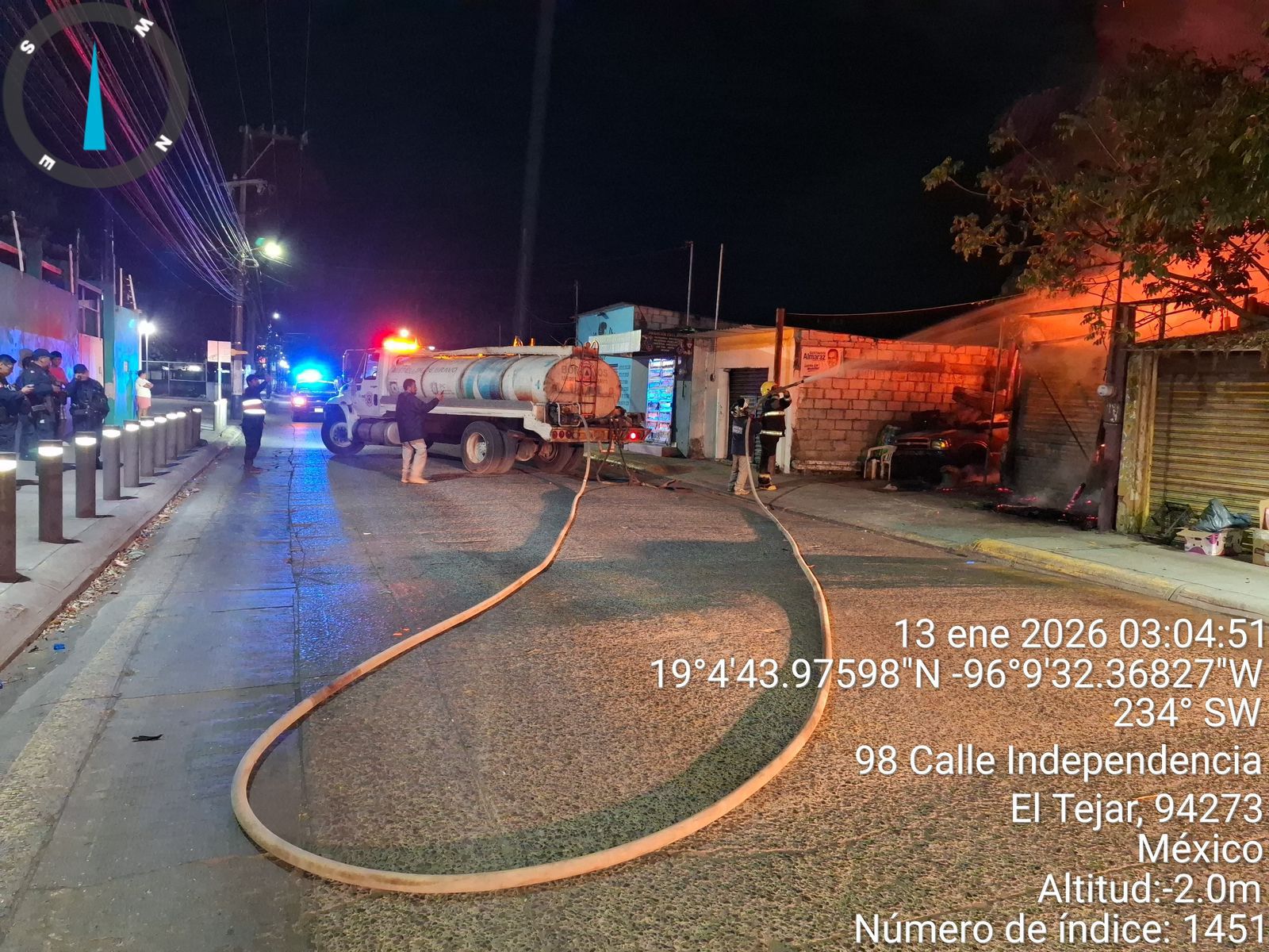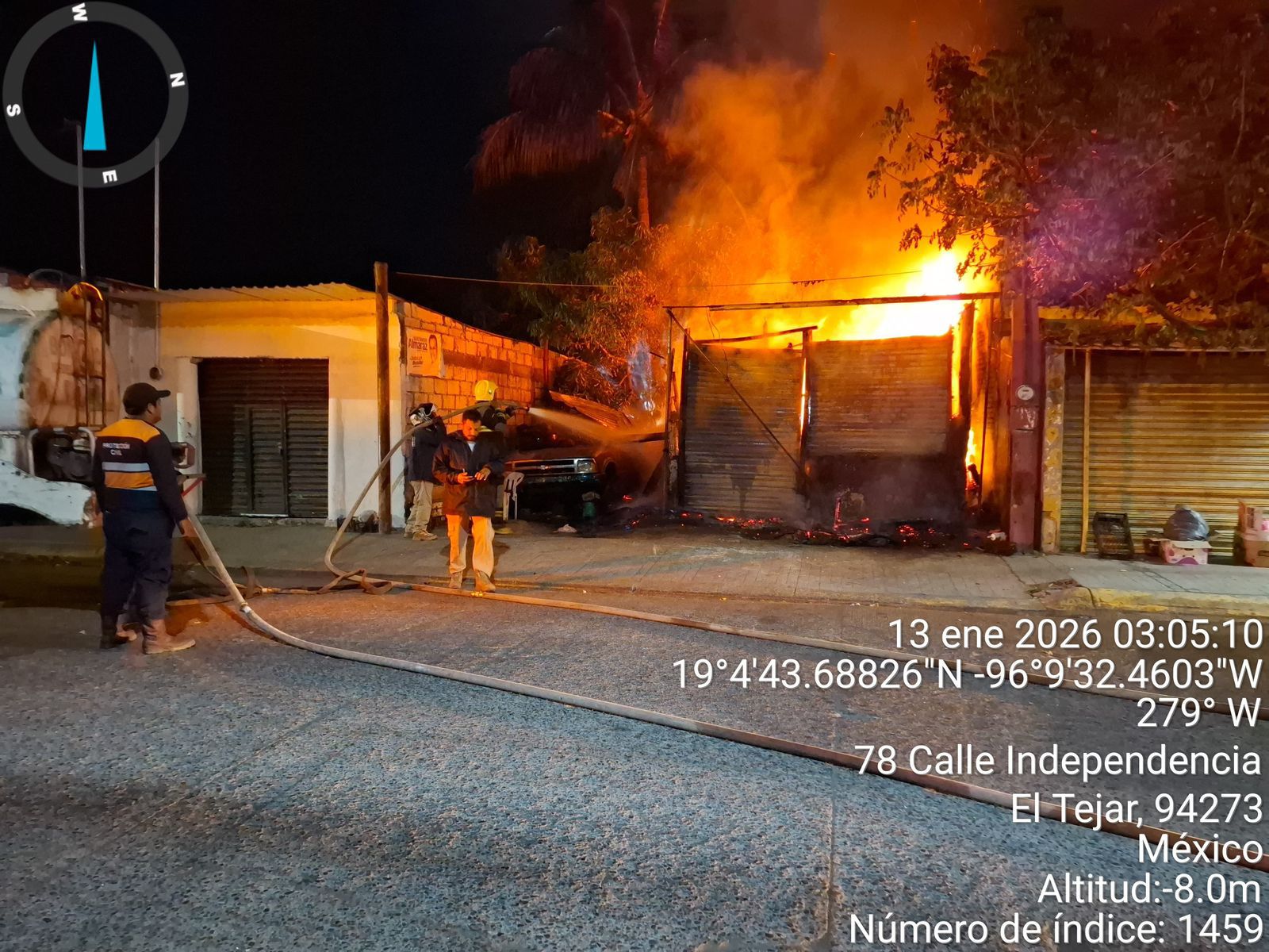 Medellín de Bravo, Veracruz., 13 de enero de 2026.- Por instrucciones del alcalde Samuel Acosta, personal de la Dirección de Protección Civil Municipal, a cargo de Antonio Rosas, atendió de manera inmediata el incendio registrado la madrugada de este martes en un taller mecánico, ubicado sobre la avenida Independencia, en la localidad de El Tejar.