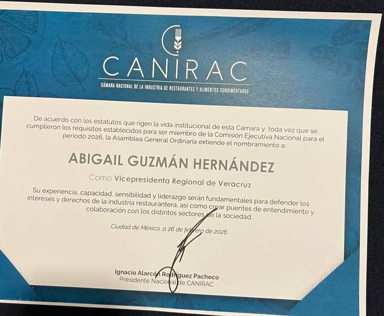 La Presidenta en Veracruz de la Cámara Nacional de la Industria Restaurantera y Alimentos Condimentados, Abigail Guzmán Hernández, fue nombrada también miembro de la Comisión Ejecutiva Nacional para el periodo 2026, con el reconocimiento de la asamblea general.